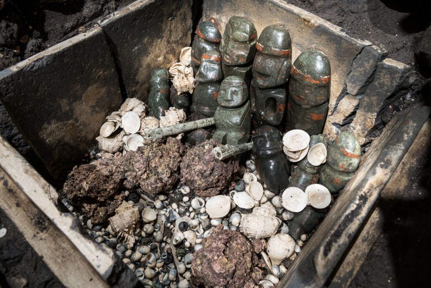 Trzy lata temu informowaliśmy o spektakularnym odkryciu (depozyt 186) dokonanym przez specjalistów z Proyecto Templo Mayor (PTM). Znaleziono wówczas tepetlacalli, kamienną skrzynię wypełnioną piętnastoma figurkami w stylu mezcala, koralikami, muszlami i koralowcami. W tym samym roku znaleziono dwie kolejne skrzynie, w których znajdowało się 15 (depozyt 187) i 13 (depozyt 189) figurek. Nikt wtedy nie spodziewał się, że był to zaledwie fragment znacznie większej układanki.