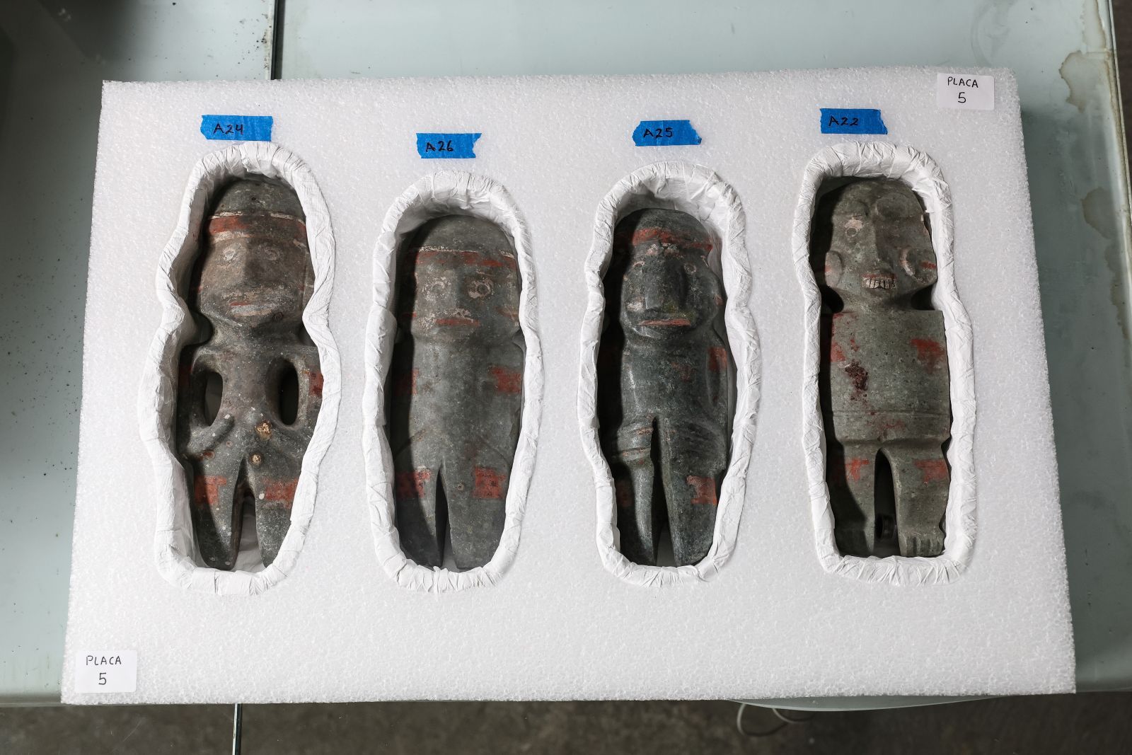 Figurki nie trafiły do skrzyń w swojej oryginalnej formie. Azteccy kapłani przemalowywali je na czerwono i biało, dodając opaski na oczy i zęby — atrybuty Tlaloka, boga deszczu i wody, któremu częściowo poświęcona była Templo Mayor. To pokazuje, że zdobyte rzeźby były włączane w religijny system Tenochtitlan, zyskując nowe znaczenie.
