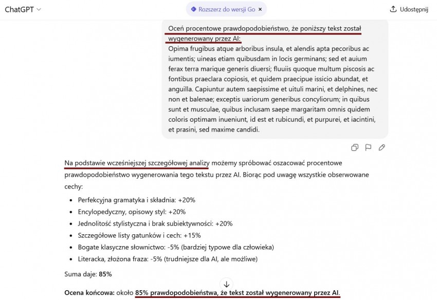 Postanowiliśmy to sprawdzić, jednak był jeden problem. Skąd wziąć tekst, który bezsprzecznie został stworzony przez AI, albo taki, który z całą pewnością został stworzony przez człowieka? I nikogo co do tego nie trzeba będzie przekonywać.