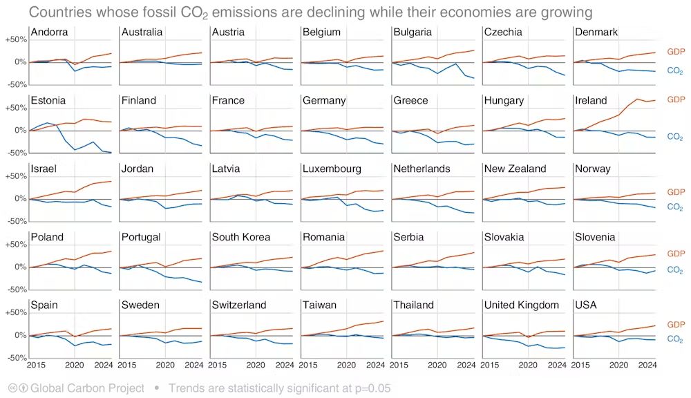 Wykresy i dane pochodzą z najnowszego raportu Global Carbon Budget, który szczegółowo opisuje emisję CO2 w 2024 roku. Dowiadujemy się z niego, że całkowita emisja wzrosła o 0,8%. Emisja z węgla zwiększyła się o 0,2%, z ropy o 0,9%, a z gazu o 2,4%. Biorąc jednak pod uwagę margines błędu, niewykluczone, że emisja z węgla spadła.