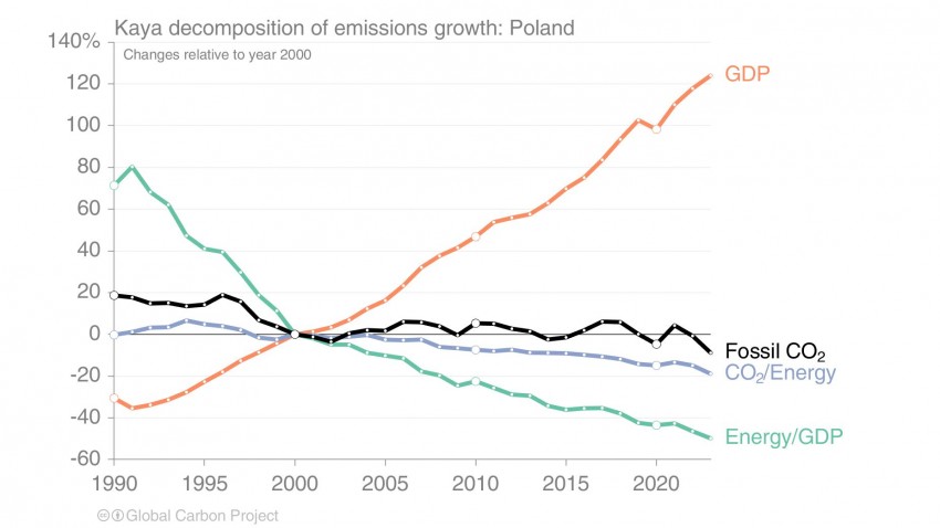 Można? Można. To co widzicie to wykres tzw. tożsamości Kai dla Polski. Pokazuje on, że pomimo zmniejszenia emisji CO2, PKB Polski rośnie. To najlepszy dowód, że odchodzenie od węgla nie jest jednoznaczne z kryzysem gospodarczym, a używanie węgla i innych paliw kopalnych nie jest warunkiem niezbędnym do rozwoju gospodarczego. Polska jest jednym z 35 krajów na świecie, w którym nastąpiło rozłączenie emisji CO2 ze wzrostem gospodarczym. Innymi słowy, jest jednym z 35 krajów, które notują wzrost PKB przy jednoczesnym spadku emisji.