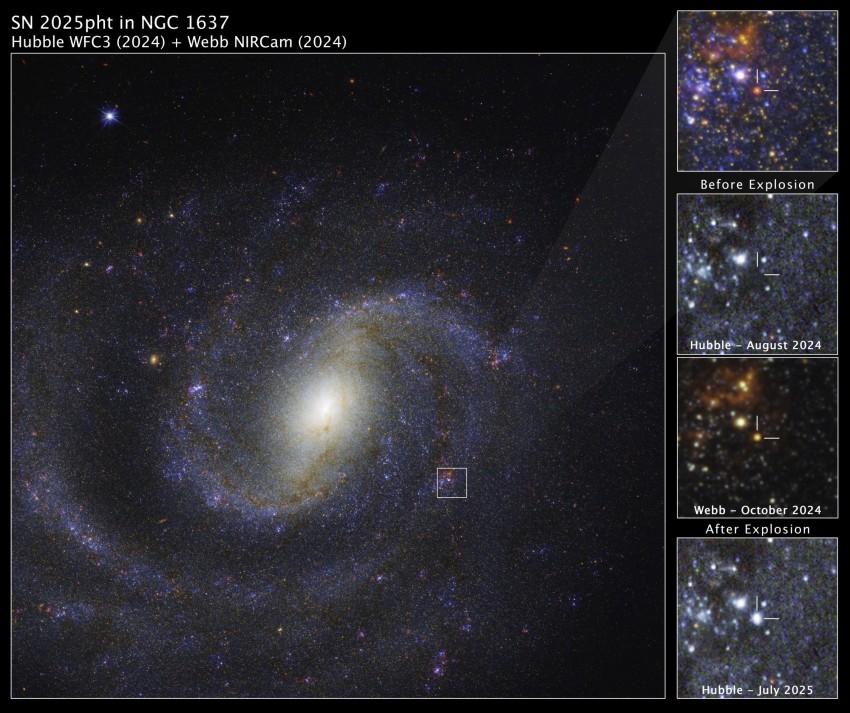 Naukowcy, korzystając z All-Sky Automated Survey of Supernovae, najpierw odkryli supernową SN2025pht. Zauważyli ją 29 czerwca bieżącego roku. Znajduje się ona w pobliskiej galaktyce NGC 1637, oddalonej od Ziemi o 40 milionów lat świetlnych. Porównując obrazy galaktyki wykonane przez Hubble'a i JWST odnaleźli gwiazdę progenitorową (gwiazdę macierzystą) supernowej. Okazało się, że jest ona niezwykle jasna i świeci na czerwono. Mimo, że jej jasność była 100 000 razy większa od jasności Słońca, większość światła była blokowana przez pył. Tak bardzo blokował on blask gwiazdy, że na zdjęciach w zakresie światła widzialnego wydawała się ona 100-krotnie ciemniejsza, niż była w rzeczywistości. Jako, że pył blokuje głównie krótszy zakres fal, światło niebieskie, gwiazda wydawała się też wyjątkowo czerwona. To najbardziej czerwony i otoczony najgęstszą zasłoną pyłu czerwony nadolbrzym, który zmienił się w supernową, stwierdzają badacze.