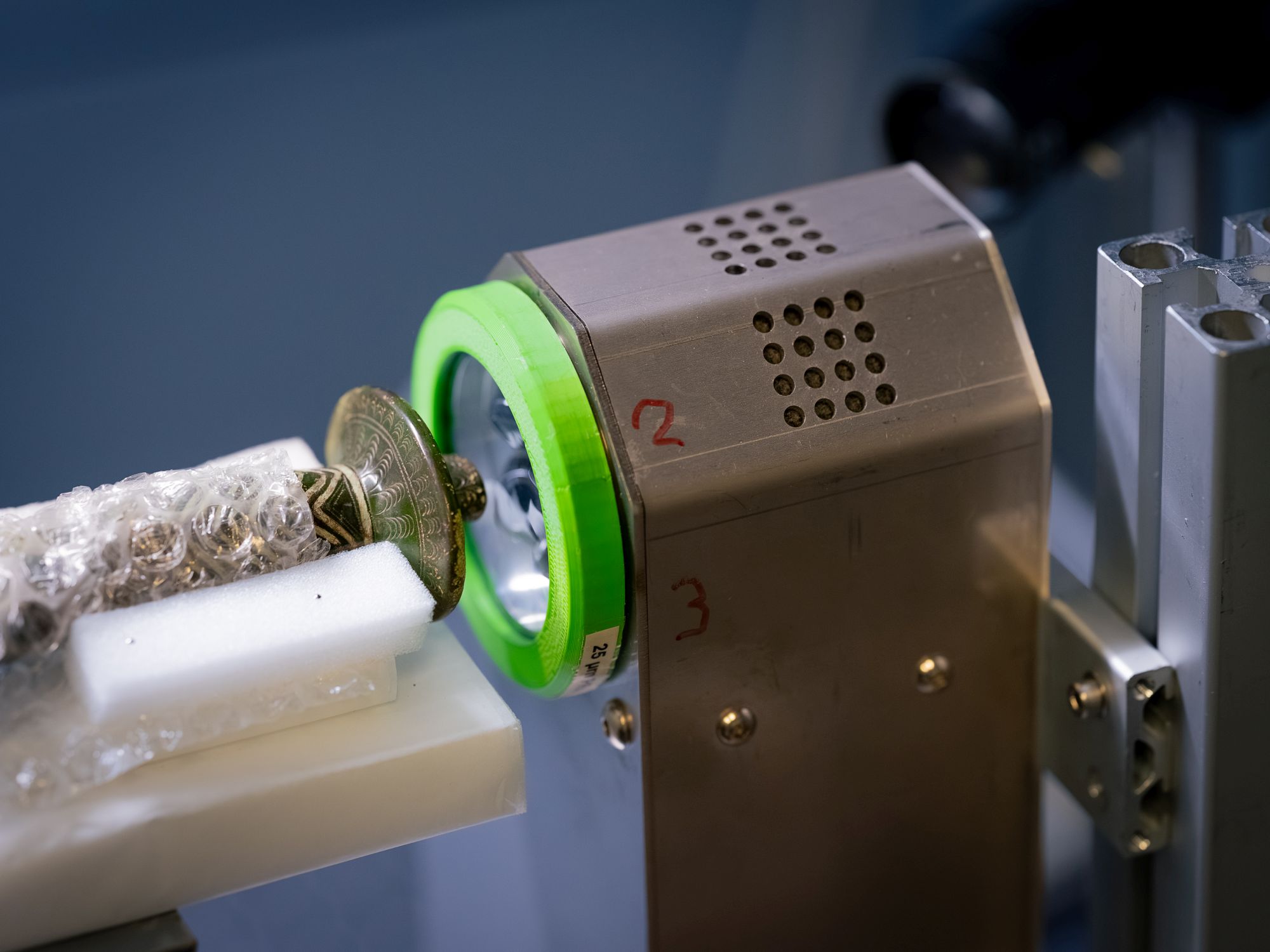Zespół pracowni tomografii komputerowej wykonał trójwymiarowy obraz miecza. Pokazał on, że ostrze zostało połączone z rękojeścią za pomocą trzpienia, a całość wzmocniono nitami. Głowica rękojeści i znajdująca się pod nią płytka zostały ozdobione głębokimi rowkami tworzącymi wzór geometryczny. Na wzorze są widoczne ślady innego materiału, ale nie było jasne, co to za materiał. Zagadkę tę rozwiązano dzięki synchrotronowi BESSY II. Naświetlamy powierzchnię głowicy intensywnym promieniowaniem synchrotronowym. Wzbudza ono atomy w materiale, powodując emisję charakterystycznego dla danego pierwiastka promieniowania rentgenowskiego, które następnie mierzymy. W ten sposób możemy wykryć nawet najdrobniejsze ślady pierwiastków, wyjaśnia doktor Martin Radtke, który zajmował się tym etapem badań.