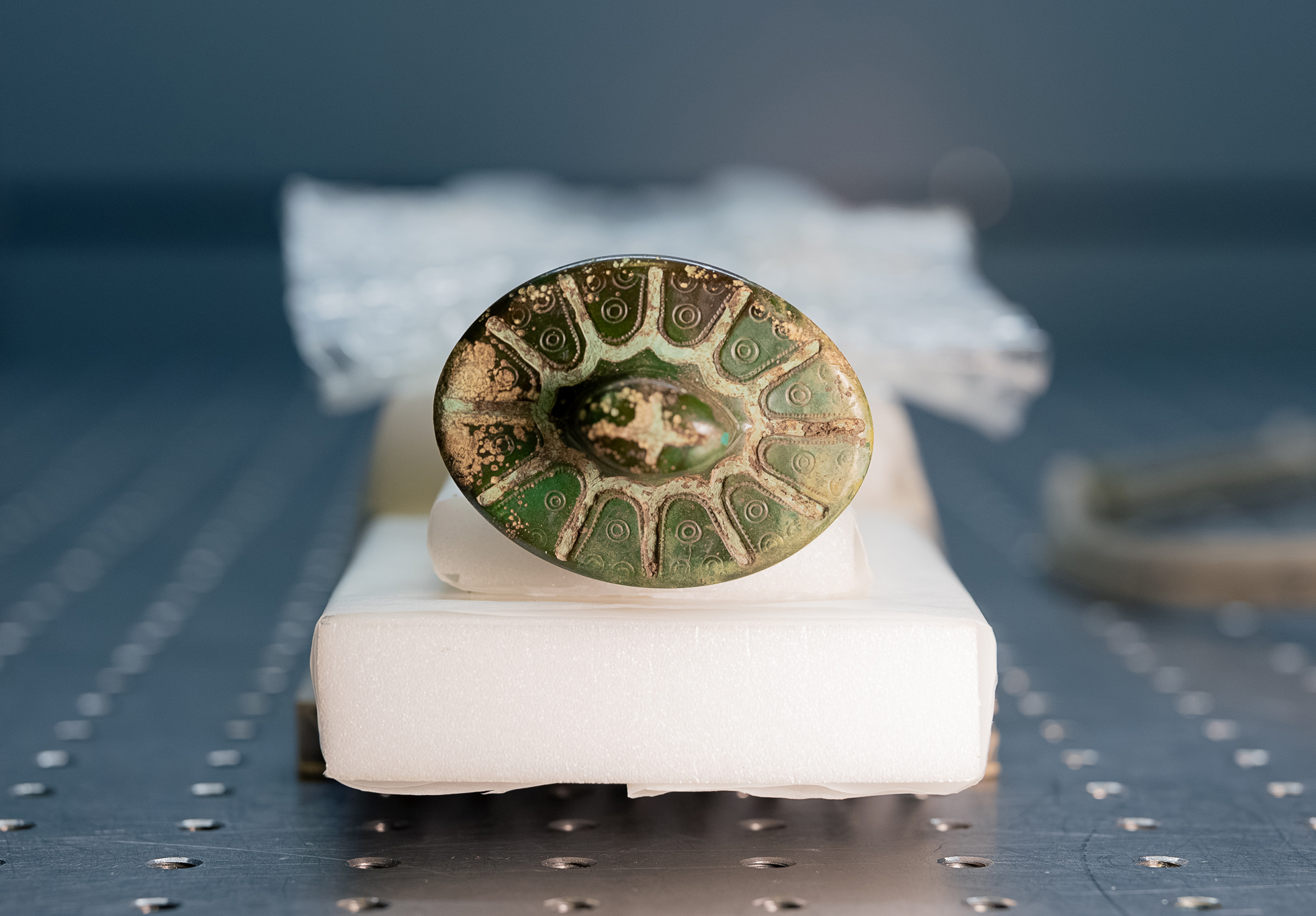Analizy pokazały, że głowica rękojeści i płytka były inkrustowane miedzianym drutem. Informacja taka zaskoczyła konserwatorkę Beate Herbold, która wraz z doktorem Johannem-Friedrichem Tolksdorfem z Bawarskiego Krajowego Urzędu Ochrony Zabytków przywieźli miecz do Berlina. Na podstawie wyglądu spodziewałam się, że do dekoracji użyto cyny, która jest bardziej miękka i łatwiej z nią pracować niż z miedzią. Byłam więc zaskoczona. To pokazuje, jak bardzo rozwinięte było rzemiosło w tamtych czasach.