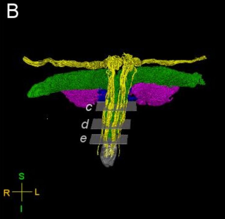 Tak wygląda łechtaczka. A dokładniej jej nerw grzbietowy (żółty), ciała jamiste (zielone), sieć żylna (niebieski), ciało gąbczaste (purpurowo-różowy) oraz żołądź (przezroczysty szary). Będziecie zaskoczeni – sam się bardzo zdziwiłem – że dopiero teraz opisano szczegółową anatomię układu nerwowego łechtaczki. A pomógł w tym synchrotron.