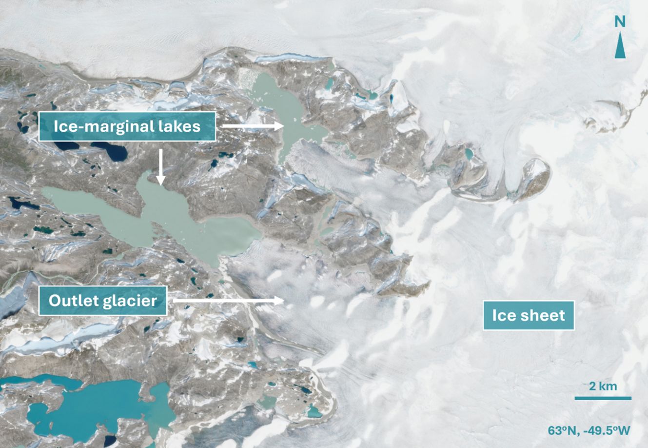 Obecnie około 10% czoła lądolodu Grenlandii ma kontakt z jeziorami. Podobnie jak ma to miejsce w przypadku lodowców spływających do morza, lodowce kończące się na jeziorach również podlegają ruchom wody, są przez nią ogrzewane i może dochodzić do ich cielenia.